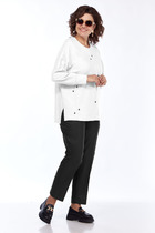 Прежде всего, его выделяет роскошная ткань с геометрическим крупным рисунком, которая позволяет создать такой великолепный вариант брючного комплекта, который составит конкуренцию любому платью.  Прямые линии, минимум декоративных элементов этот костюм как чистый лист, позволяет при помощи аксессуаров создать свои, неповторимые сеты.