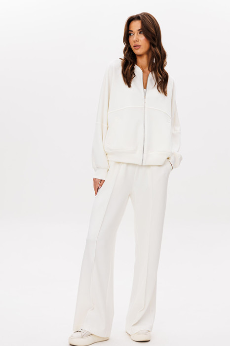Костюм состоит из свободной лёгкой куртки на разъёмной тесьме -молнии и прямых брюк.