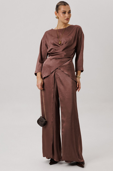 Невероятная блуза из одноимённой ткани завершает образ, превращая его в платье или даже комбинезон.