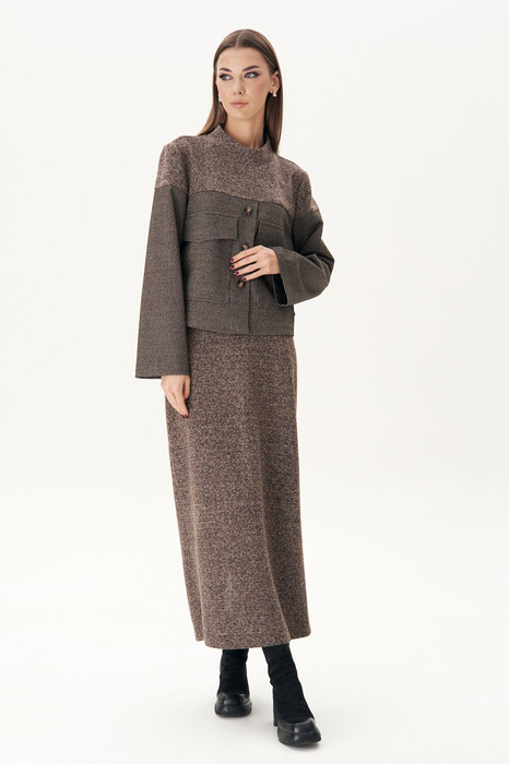 Жакет комбинированный из разных полотен. Мягкий уютный трикотаж в верхней части и комфортный текстиль в нижней. Силуэт упрямлённый, покрой втачной, воротник-стойка. Полочки с большими накладными карманами с клапаном и имитацией застёжки на пуговицы. Спинка со средним швом.