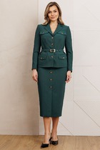 Юбка прямая. с эффектной шлицей по левой стороне переда и отделкой из контрастного полотна. Пояс юбки на эластичной тесьме в области спинки, с застёжкой по центру заднего полотнища.