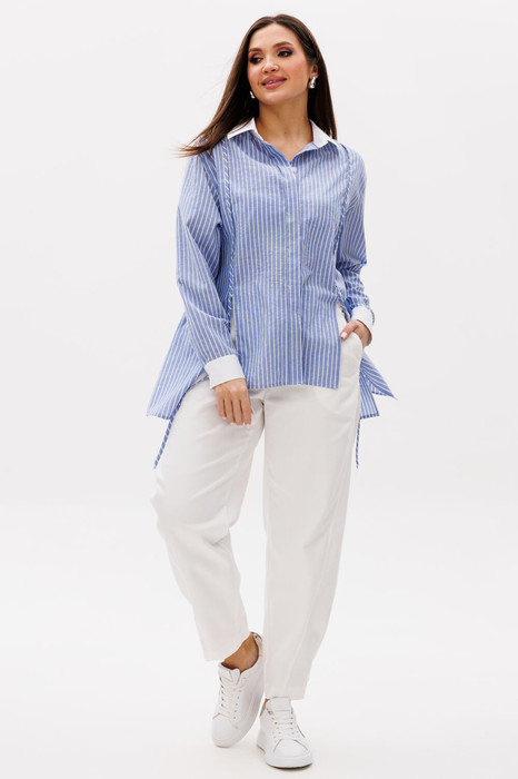 Свободный расширенный силуэт, рубашечный покрой, потайная застежка на петли и пуговицы, рубашечный рукав и воротник. Полочка с вертикальными рельефами, разрезом и отделкой под углом 45 градусов. Спинка с центральным швом с отделкой из тесьмы под углом 45 градусов.