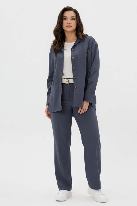 Несмотря на то, что это достаточно выдержанный ансамбль, сочетание рубашки с длинным рукавом и брюк - постоянный выбор трендсеттеров, пленяющих сердца тех, кто старается следить за направлениями в моде. Свободная классического, рубашечного покроя, с цельной застёжкой и классическим рубашечным воротником. Полочка с накладным карманом, спинка с отрезной кокеткой и мягкой бантовой складкой. Рукав рубашечный с отрезной манжетой на застёжке. Брюки классические на притачном поясе со шлёвками с наклонными боковыми карманами. По передним половинкам брюк - мягкие складки, по задним половинкам - вытачки и прорезной карман с листочкой.
