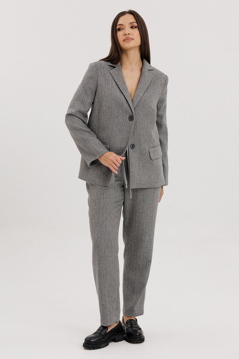 Силуэт свободный, слегка упрямлённый, покрой-втачной, воротник классический английский, линия борта фигурная, застёжка на две петли и пуговицы. Полочка с отрезным бочком, нагрудной вытачкой и прорезным карманом с клапаном. Спинка со средним швом и талиевой вытачкой. Рукав двухшовный с отлетной шлицей и отделочными пуговицами. Брюки свободные, на эластичном поясе с люверсами и отделочным шнуром. Передние половинки с боковыми накладными карманами. Длина пиджака около 67 см, длина рукава около 60 см. Длина брюк около 98 см