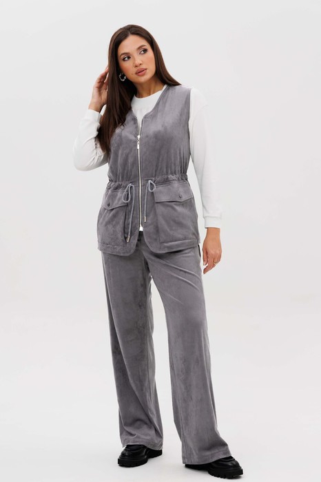 Образ, который говорит сам за себя, смелый и дерзкий, и в то же время очень комфортный. Нестандартный жилет с накладными карманами-пеналами с клапаном. Регулирующая кулиса, подчеркивающая талию. Свободный силуэт, центральная застежка на тесьму молнию, фигурная линия низа. Жилет на подкладке.