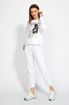 Свитшот свободный, с заниженной линией плеча, регулирующей кулисой с фиксаторами по низу изделия, притачными манжетами по низу рукава из отделочного полотна, горловина изделия также выполнена из этого материала.