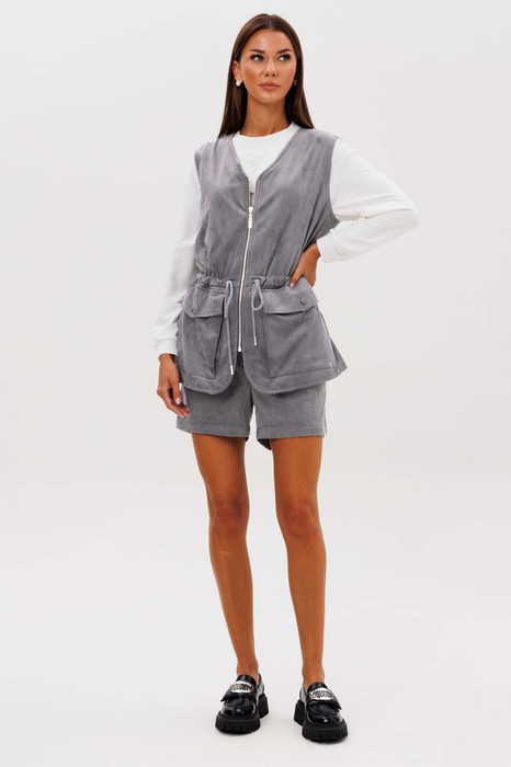 Образ, который говорит сам за себя, смелый и дерзкий, и в то же время очень комфортный. Нестандартный жилет с накладными карманами-пеналами с клапаном. Регулирующая кулиса, подчеркивающая талию. Свободный силуэт, центральная застежка на тесьму молнию, фигурная линия низа. Жилет на подкладке.
