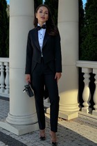 Блуза выполнена из нежного трикотажа с лёгким ворсом — материал красиво драпируется и придаёт образу уют. Брюки классического кроя с высокой посадкой и застроченными стрелками визуально вытягивают силуэт и создают безупречную посадку.