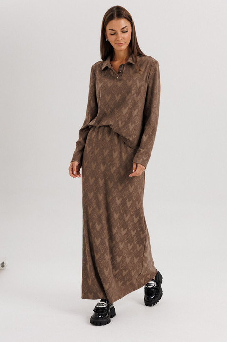 Это модный сет из мягкого трикотажа, включающий в себя джемпер-поло и юбку-«рыбку».