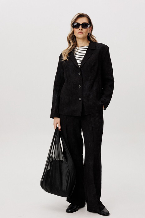 Жакет и брюки формируют лаконичный, структурированный силуэт, визуально вытягивая фигуру. Широкий крой брюк добавляет образу динамики и обеспечивает свободу движений.