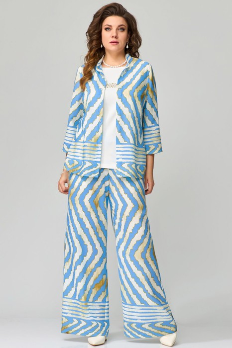 Комплект женский нарядный "Санда" летний для выхода и повседневного образа (блузка, брюки, топ). Блузка прямого силуэта, застежка однобортная, на кнопки, по горловине стойка, по полочке - нагрудная выточка. Спинка в блузке без шва, рукав одношовный 7/8. Низ блузки и рукава обработан швом в подгибку с закрытым срезом. Брюки - прямого силуэта, в боковом шве - карманы, пояс на резинке, низ брюк обработан швом в подгибку, с закрытым срезом. Топ с печатью на полочке, изготовлен топ из трикотажной ткани, полуприлегающего силуэта. По полочке топа - нагрудная выточка, проймы и горловина обработаны планкой, низ изделия обработан на распошивалке.