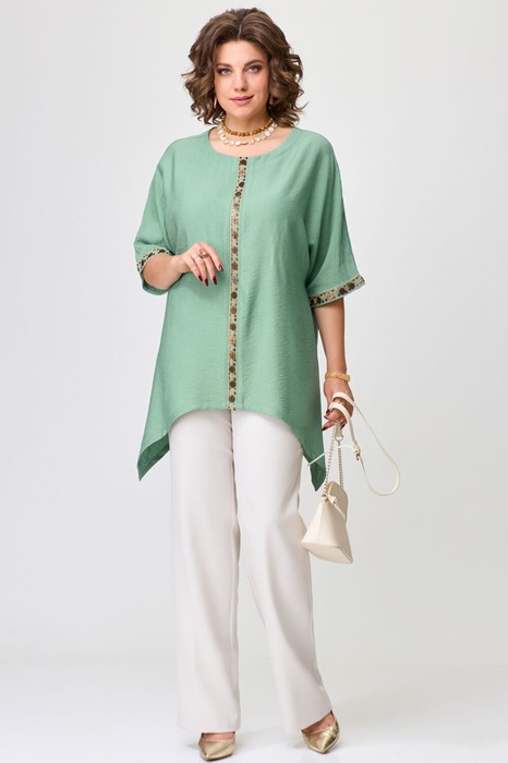 "Женский комплект ""Удеса"" состоит из брюк и туники свободного покроя. Туника оверсайз выполнена из текстильной ткани без подкладки, ткань легкая, стрейч и очень практичная в носке. Рукав цельнокроеный, горловина обработана обтачкой, обтачка закреплена отделочной строчкой. Низ изделия обработан швом в подгибку, по центру полочки нашита тесьма (монетки на сетке), низ рукава тоже обработан декоративной тесьмой.