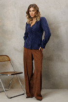 Брюки - прямого силуэта, в боковом шве - карманы, пояс на резинке, низ брюк обработан швом в подгибку, с закрытым срезом. В боковых швах лампасы из отделочной ткани."
