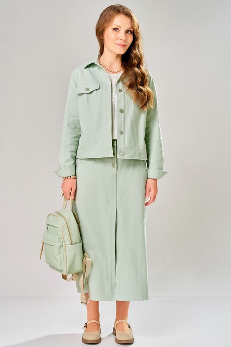 Юбка, слегка расширенная к низу, выполнена из нежной итальянской джинсовой ткани, без подкладки. По переднему полотнищу юбки застежка на петли и пуговицы. По среднему шву юбки идет сквозная планка. По полочке кокетка и рельефные карманы. На заднем полотнище юбки - кокетка и накладные карманы. Верх юбки обработан притачным поясом, низ изделия обработан швом в подгибку с закрытым срезом.
