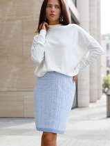 Джинсовый женский костюм с брюками и рубашкой. Рубашка из натурального трикотажного полотна свободного силуэта со втачными рукавами, рубашечным воротником и планкой-застежкой из джинсовой ткани в тон брюк. Брюки полуприлегающего силуэта, прямые к низу; пояс притачной на резинке по бокам и карманами по передним половинкам; по спинке функциональные накладные карманы; низ с необработанным краем.
