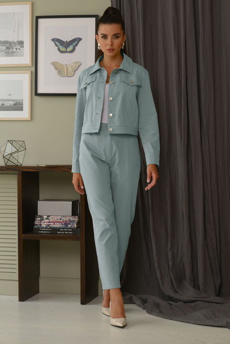 Костюм женский - жакет и брюки, изготовлен из текстильной ткани с небольшим содержанием стрейча. Жакет длиной немного ниже линии талии. Рукав длинный, рубашечного типа, линия проймы спущена. Застежка до верха на петли и пуговицы. В верхней части переда и спинки - кокетки. Нижняя часть переда и спинки оформлена вертикальными рельефами. По переду под кокетками находятся декоративные клапаны. На задней части рукава-рельеф с манжетой внизу и застежкой на петли пуговицы. Низ жакета оформлен планкой. Воротник стояче - отложной, без  стойки спереди.