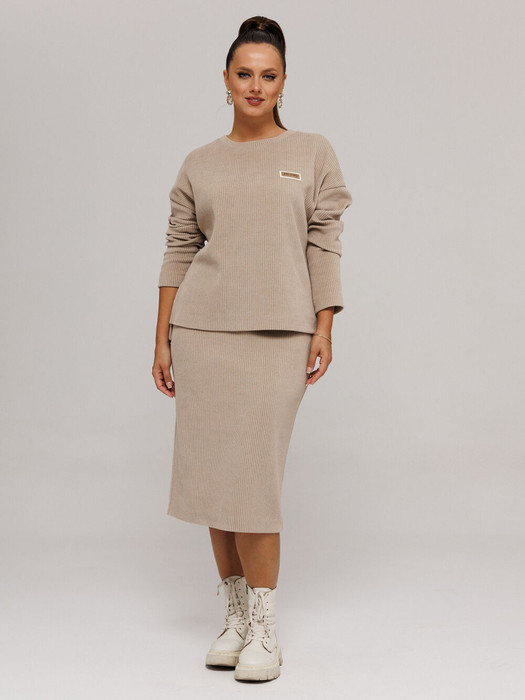 Данный комплект выполнен из мягкого трикотажного полотна, идеально подойдёт для демисезонного периода, благодаря натуральному составу в нём будет тепло но не жарко.Свитшот свободного кроя с длинными рукавами и спущенным плечом, предаёт образу мягкость и непринуждённость.Горловина выполнила из отделочной ткани в "рубчик"что является очень функциональным и стильным элементом.Юбка прямая, на подкладке, на поясе, слегка зауженная к низу. Длина ниже линии колена. Средний шов юбки заканчивается шлицей.