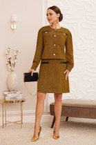 Костюм состоит из жакета и брюк из хлопковой ткани. Жакет полуприлегающего силуэта с воротником пиджачного типа. Застежка однобортная на две пуговицы. Перед с талиевой вытачкой, рельефом и декоративным клапаном. Спинка с рельефами из проймы и средним швом. Рукав втачной двухшовный. Брюки расширеные книзу на притачном поясе. По поясу настрочены шлевки. По передним и задним частям брюк вытачки. На задних частях брюк настрочены карманы. Карманы, вытачки, пояс, низ брюк отделаны отделочной строчкой. Длина жакета - 68см, длина рукава жакета - 60 см, длина брюк с учетом пояса -107 см