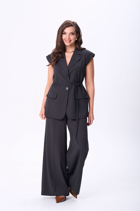 Костюм состоит из жилета и брюк, выполеных из костюмной ткани. Жилет полуприлегающего силуэта  с воротником пиджачного типа.  Перед с рельефами, талиевой вытачкой и декоративным клапаном.  Застежка центральная однобортная на 2 петли и пуговицы. Спинка со средним швом и рельефами. Вдоль оката рукава выполнена декоративная планка. К жилету прилагается тонкий пояс из основной ткани.  Брюки расширеные книзу с притачным поясом. Спереди застежка гульфик на молнии и с петлей и пуговицей по поясу. По задней частям брюк вытачки. В боковых швах карманы с наклонным входом. По поясу широкие шлевки. Брюки со срелками застроченными по переду и заутюженными сзади. Длина жилета - 71 см, длина брюк с учетом пояса - 109 см.