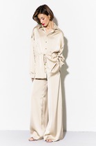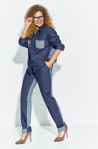 Джемпер прямого силуэта с воротником поло. Рукав втачной одношовный. По низу изделия, по низу рукава и по воротнику проложена отделочная строчка. Брюки расширеные книзу на притачном поясе. По поясу настрочены шлевки. По передним и задним частям брюк вытачки. На задних частях брюк настрочены карманы. Карманы, вытачки, пояс, низ брюк отделаны отделочной строчкой. Длина брюк с учетом пояса - 109 см, длина джемпера- 66 см, длина рукава - 30 см,