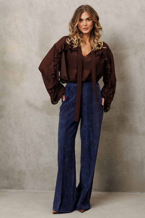 Костюм состоит из блузки и брюк. Блузка свободного силуэта из струящейся шифоновой ткани. Перед и спинка с кокеткой и сборкой. Рукав спущенный свободный с резинкой понизу. Вдоль линии кокетки и рукава вставлена рюша. Горловина V-образной формы с воротником стойкой переходящей в бант.  Брюки палаццо с притачным поясом из мягкой вельветовой ткани. Спереди застежка гульфик на молнии и петлей и пуговицей по поясу. По задней частям брюк вытачки. Пояс с резинкой в боковых частях. Брюки с заутюженными стрелками. Длина блузки - 67см, длина рукава - 60 см. Длина брюк с учетом пояса - 109 см.