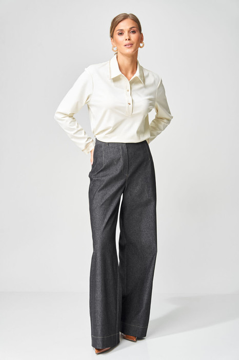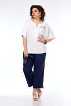 Джемпер прямого силуэта с воротником поло из плотной хлопковой ткани "двухнитка". Рукав втачной одношовный. По низу изделия, по низу рукава и по воротнику проложена отделочная строчка. Брюки расширеные книзу на притачном поясе из джинсовой хлопковой ткани. По поясу настрочены шлевки. По передним и задним частям брюк вытачки. На задних частях брюк настрочены карманы. Карманы, вытачки, пояс, низ брюк отделаны отделочной строчкой. Длина джемпера- 66 см, длина рукава - 60 см. Длина брюк с учетом пояса - 109 см
