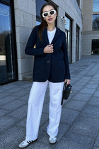 Современный женский костюм состоит из рубашки покроя оверсайз и прямых. Костюм изготовлен из футера с начесом. Рубашка с классическим рубашечным воротником с застежкой на петли и пуговицы. На передах накладные карманы с клапанами. Спинка с кокеткой и двумя складками из-под нее. Рукава длинные, имеют манжеты с застежкой на петлю и пуговицу. Низ изделия и клапаны имеют не обработанный край, но укреплен специальной строчкой. Брюки длинные, прямые. По передним половинкам функциональные карманы. Пояс из ткани кошкорсе, с резинкой и шнуром внутри.