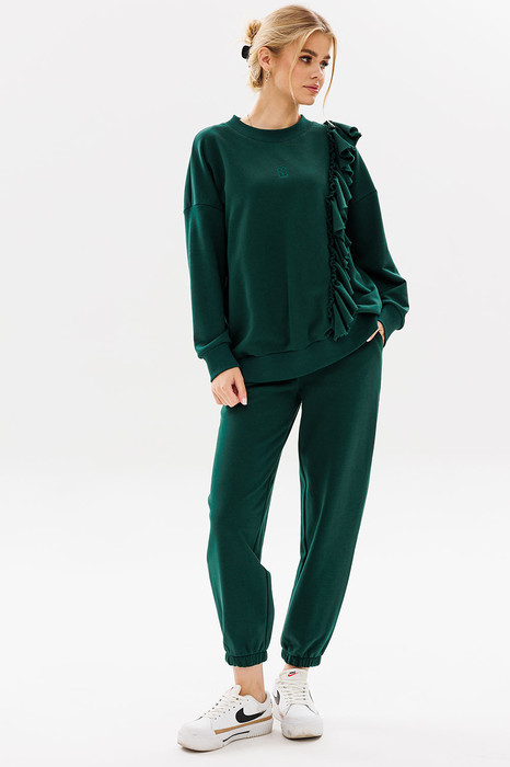 Современный, женственный костюм, покроя oversize из комфортной ткани (футера пенье). Костюм состоит из джоггеров и свободного свитшота с воланом. Волан с необработанным краем (укреплён строчкой для надежности) пришит асимметрично на левой стороне изделия. Свитшот имеет спущенную линию плеча, прямой силуэт и притачную манжету по низу изделия. По центру переда вышивка – логотип в цвет ткани. Рукава с притачной по низу манжетой. Бейка горловины, низ изделия и манжеты рукавов выполнены из ткани - компаньона кошкорсе. Брюки с притачным поясом, резинкой внутри. Передняя половинка брюк с удобными боковыми карманами. Низ брюк присобран на резинку.