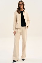 Современный, женственный костюм, покроя oversize из комфортной ткани (футера пенье). Костюм состоит из джоггеров и свободного свитшота с воланом. Волан с необработанным краем (укреплён строчкой для надежности) пришит асимметрично на левой стороне изделия. Свитшот имеет спущенную линию плеча, прямой силуэт и притачную манжету по низу изделия. По центру переда вышивка – логотип в цвет ткани. Рукава с притачной по низу манжетой. Бейка горловины, низ изделия и манжеты рукавов выполнены из ткани - компаньона кошкорсе. Брюки с притачным поясом, резинкой внутри. Передняя половинка брюк с удобными боковыми карманами. Низ брюк присобран на резинку.