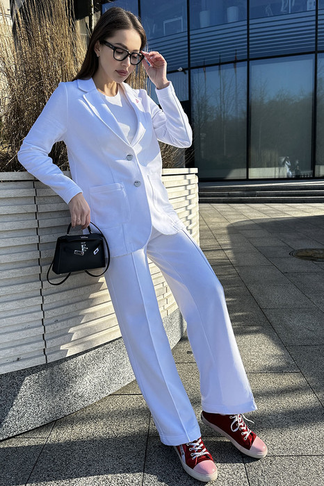 Костюм Gowear из футера в стиле smart casual поможет создать в меру строгий и одновременно расслабленный образ. Костюм состоит из жакета и прямых брюк. Жакет прямого силуэта с воротником и лацканами, имеет удобные карманы и застежку на 2 пуговицы. На левом лацкане вышивка-логотип в контрастном цвете. Низ и борта имеют открытые края (эффект необработанного шва), укреплены дополнительной строчкой. Жакет без подкладки. Брюки прямые. На передних половинках - отделочная строчка по стрелкам и удобные боковые карманы. Пояс из ткани кошкорсе, с резинкой и контрастным шнурком.
