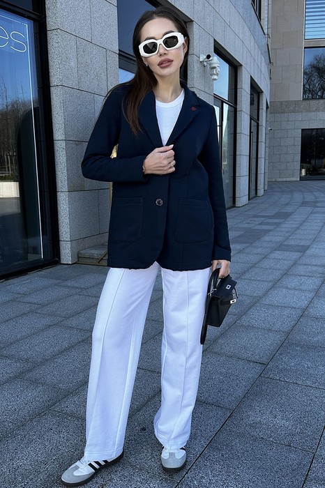 Костюм Gowear из футера в стиле smart casual поможет создать в меру строгий и одновременно расслабленный образ. Костюм состоит из жакета и прямых брюк. Жакет прямого силуэта с воротником и лацканами, имеет удобные карманы и застежку на 2 пуговицы. На левом лацкане вышивка-логотип в контрастном цвете. Низ и борта имеют открытые края (эффект необработанного шва), укреплены дополнительной строчкой. Жакет без подкладки. Брюки прямые. На передних половинках - отделочная строчка по стрелкам и удобные боковые карманы. Пояс из ткани кошкорсе, с резинкой и контрастным шнурком.