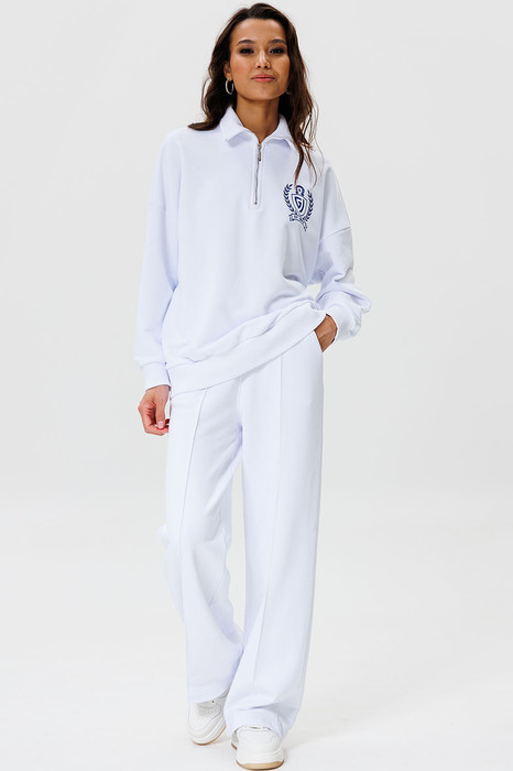 Женский яркий, повседневный костюм, состоящий из оверсайз свитшота с контрастной вышивкой и брюк со стрелками. Это находка для тех, кто ценит свободу, стиль и не хочет отказывать себе в комфорте 24/7.
