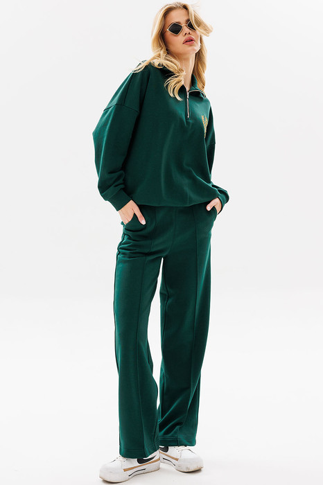 Женский яркий, повседневный костюм, состоящий из оверсайз свитшота с контрастной вышивкой и брюк со стрелками. Это находка для тех, кто ценит свободу, стиль и не хочет отказывать себе в комфорте 24/7.