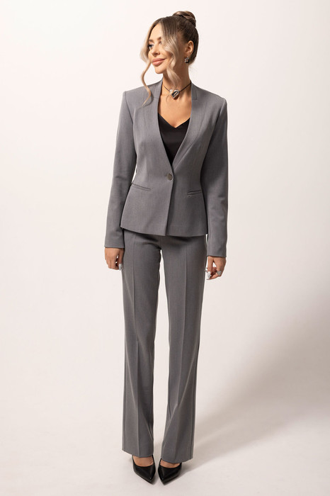 Жакет с центральной застежкой на петлю и пуговицу, с отрезной стойкой. Перед с вытачками от прорезного кармана с листочкой и рельефами от проймы. Бочок спинки жакета переходит на перед. На переде жакета отрезные детали вдоль линии подборта. Спинка со средним швом, вытачками и рельефами выходящим из проймы.