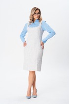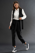 Жакет с центральной застежкой на петли и пуговицы, втачным воротником и отложными лацканами пиджачного типа. По боковым швам со шлевками для съемного пояса. Брюки с отрезным поясом, на поясе расположены шлевки. Передние половинки с карманами, двумя односторонними складками, вход в карман наклонный к боковому шву. Застежка гульфик.