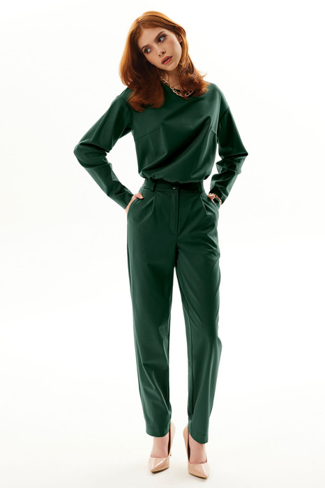 Блузон прямого силуэта, с застежкой на потайную молнию в среднем шве спинки, без воротника с круглым вырезом горловины. Плечо спущенное. По переду с нагрудными вытачками. Спинка со средним швом. Рукав втачной, длинный Брюки зауженные к низу, с отрезным поясом. В области спинки пояс присборен на резинку. Передние половинки с карманами, вход в карман наклонный к боковому шву. Застежка гульфик.