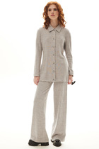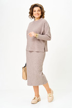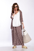 Блузон, с центральной застежкой на петли и пуговицы, отложным воротником. По переду отрезная планка. Рукав втачной, длинный. Брюки прямые, с отрезным поясом. Пояс присборен на резинку.