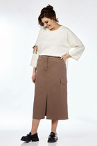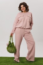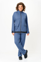 Блузон с центральной застежкой на петли и пуговицы, втачным воротником с отрезной стойкой. На уровне линии груди расположены накладные карманы. Спинка цельная. Низ фигурный. Рукав втачной, длинный, с отреной манжетой, застегивающейся на одну петлю и пуговицу. Юбка короткая, без пояса, верхний срез обработан обтачкой. Застежка на потайную молнию в среднем шве заднего полотнища.