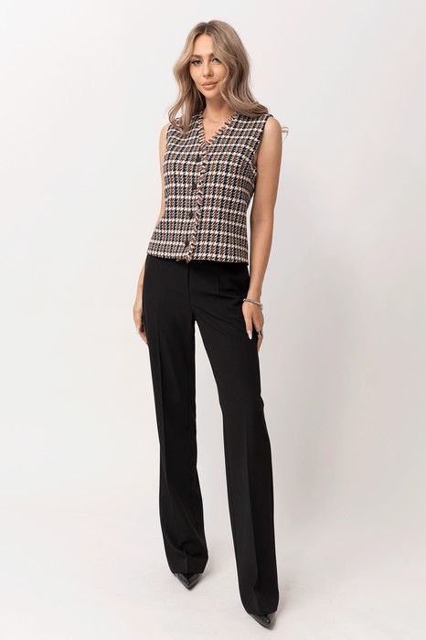 Жилет с центральной застежкой на петли и пуговицы, без воротника, с V-образным вырезом горловины. Горловина и край борта декорированы бахромой из основной ткани.. По переду с нагрудными вытачками. Спинка с талиевыми вытачками. Брюки- с отрезным поясом, на поясе расположены шлевки. По спинке пояс присборен на резинку. По боковым швам расположены карманы.  Вход в карман наклонный к боковому шву. Застежка гульфик.