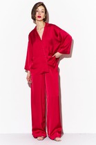 Блузка с втачным воротником с отрезной стойкой, центральной застежкой петли и пуговицы. По левой полочке на уровне груди расположен накладной карман. Спинка с отрезной кокеткой. Рукав втачной, длинный, с отрезной манжетой. Шорты прямые, с отрезным поясом, пояс присборен на резинку. В боковых швах расположены карманы. Вход в карман наклонный к боковому шву.