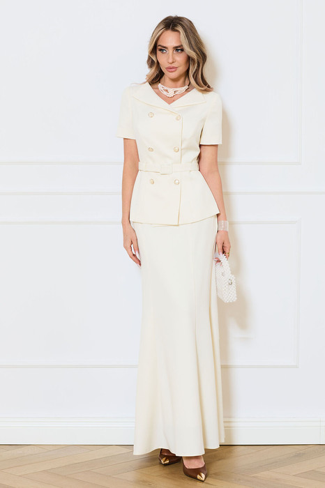 Жакет с центральной двубортной застежкой на петли и пуговицы, без воротника, с отложными лацканами. По переду с рельефами, выходящими из проймы до низа. По спинке со средним швом и рельефами, выходящими из проймы до низа. Жакет со сьемным поясом. На уровне линии талии расположены шлевки для пояса. Юбка без пояса, верхний срез обработан обтачками. Заднее полотнище со средним швом, застежкой на потайную молнию в среднем шве. Юбка силуэт- годе,с рельефными швами по переднему и заднему полотнищу.