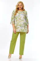 Блузка с центральной застежкой на петли и пуговицы, с отложным воротником. По верхней части переда- накладные карманы. Плечевой шов переходит на перед. Спинка со средним швом. Рукав втачной, короткий, с отложной манжетой. Блузка со съемным поясом. По боковым швам расположены шлевки для пояса. Брюки с отрезным поясом, на поясе расположены шлевки. На задних половинках расположены прорезные карманы с листочками. На передних половинках расположены карманы, вход в карман фигурный. Застежка гульфик.