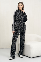 Жакет с центральной застежкой на петли и пуговицы с без воротника, с круглым вырезом горловины. По переду с рельефами, выходящими из проймы до низа и накладными карманами с клапанами, расположенными на уровне линии бедер. Спинка со средним швом, рельефами, выходящими из проймы. Жакет со съемным поясом. Рукав втачной, короткий. По низу рукава, низу клапанов, краю накладных карманов притачивается бахрома из основной ткани. Брюки без пояса, верхний срез обработан обтачками. Застежка на потайную молнию в левом боковом шве. В области спинки талия присборена с помощью резинки.