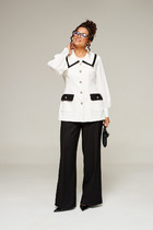 Жакет с центральной двубортной застежкой на пришивные кнопки, без воротника с отложными лацканами. По переду с рельефами, выходящими из проймы, талиевыми вытачками. Спинка со средним швом, рельефами, выходящими из проймы, талиевыми вытачками. Рукав втачной, длинный. Брюки с отрезным поясом, на поясе расположены шлевки. В боковых швах расположены карманы. Вход в карман наклонный к боковому шву. Застежка гульфик. Пояс в области спинки присборен на резинку. Костюм со съемным декоративным поясом. Декоративный пояс из кожзама, декорирован бахромой.