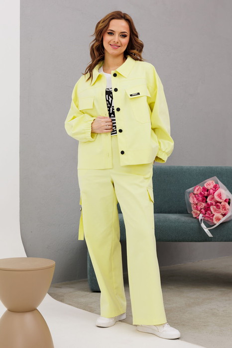 Жакет свободного силуэта, воротник рубашечного типа, рукав спущенный длинный на резинке по низу. По переду кокетка и накладные карманы с клапаном. Застежка по переду на петли и пуговицы.