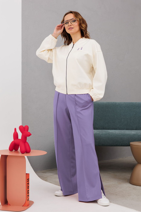 Бомбер свободного силуэта, вырез горловины округлый. Рукав спущенный, длинный, внизу на резинке. Карманы в боковых швах. Застежка на тесьму-молнию. Декором является вышивка на кокетке переда.