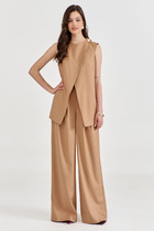 Платье-сарафан свободного силуэта, вырез горловины V-образный по переду и спинке изделие без рукавов и без застежки. По плечам завязки из основной ткани, в боковых по низу разрезы.