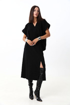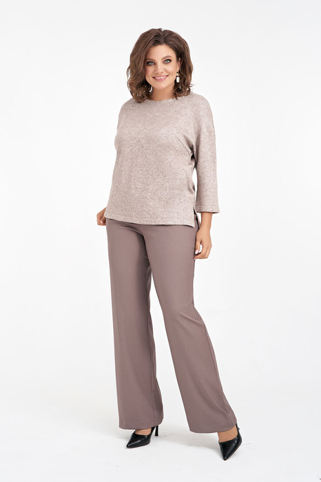Женский костюм, состоящий из джемпера и брюк. Джемпер выполнен из мягкого трикотажа с добавлением ангоры, рукава со спущенной линией плеча, горловина округлой формы, по низу джемпера и рукавов - функциональные разрезы. Брюки выполнены из костюмной ткани с содержанием вискозы, прямые к низу, пояс притачной с резинками по бокам, в боковых швах функциональные карманы.