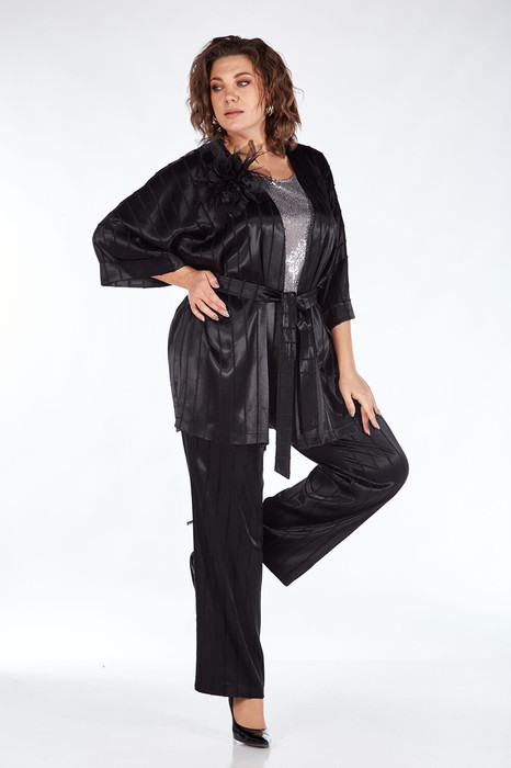Комплект брючный 3-х предметный, состоит из: Топа, жакета и брюк. Жакет выполнен из костюмно-плательной ткани, свободного кроя. Рукава длиной 3/4, по низу отложные манжеты. По боковым швам-разрезы. Брюки прямого силуэта, на поясе, застежка на тесьму-молнию и петли пуговицы. В брюках обработаны боковые карманы. Топ прямого силуэта с круглым вырезом горловины. Перед выполнен из ткани с пайетками, спинка из легкой блузочной ткани. Декор — съемный цветок.