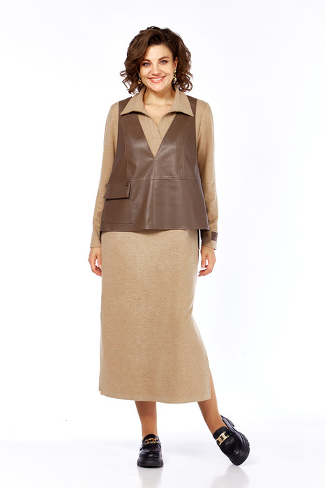 Комплект женский повседневный, состоит из жилета и платья. Жилет прямого силуэта выполнена из эко-кожи на вискозной основе. Перед разрезной по центру и по линии талии, в верхней части обработаны рельефы. В нижней части переда асимметричный накладной карман с клапаном. Спинка разрезная по центру, на кокетке. Все швы жилета отстрочены отделочными нитками. Платье выполнено из трикотажного полотна, прямого силуэта с воротником и подрезными планками. В боковых швах обработаны разрезы внизу. Рукава втачные. По низу рукава — декоративная нашивка.